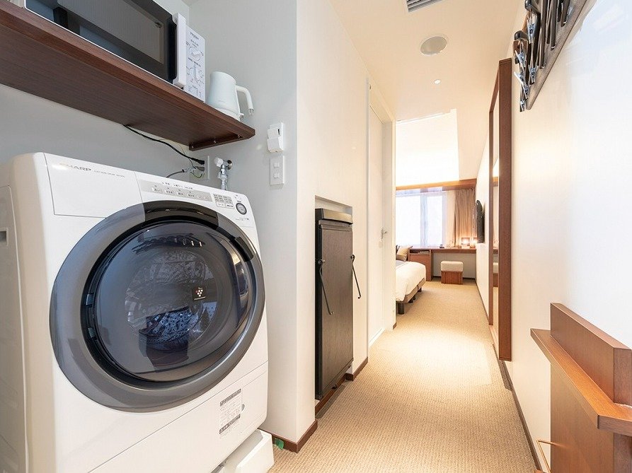 客室はダブルルームでも18平米と、ビジネスホテルではやや広めの設定です。出張客も多く、長期滞在の方でも快適に過ごせるよう、全室設置の洗濯乾燥機と電子レンジ、ゆったりとしたバスルームなど、設備も充実しています。