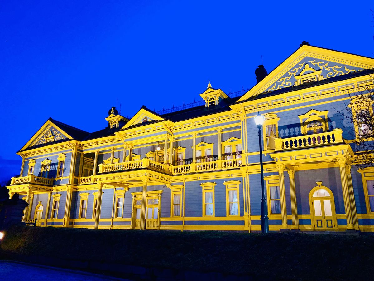 元町公園(地図7)の向こうに見えてくるのが、ブルーとイエローが美しい洋館、「旧函館区公会堂(地図8)」です。